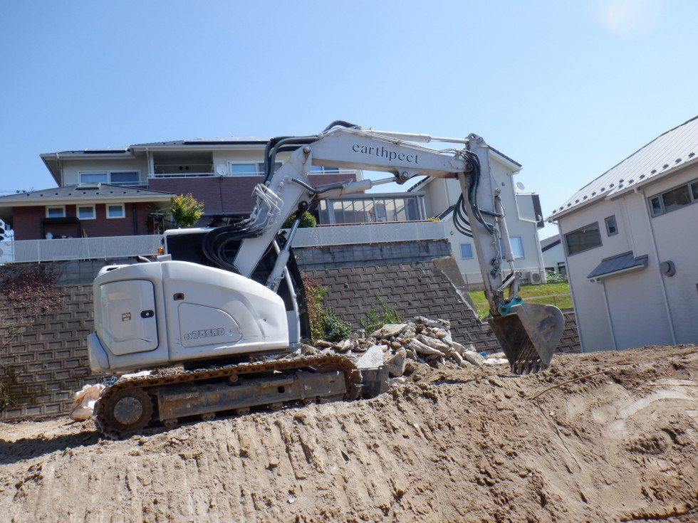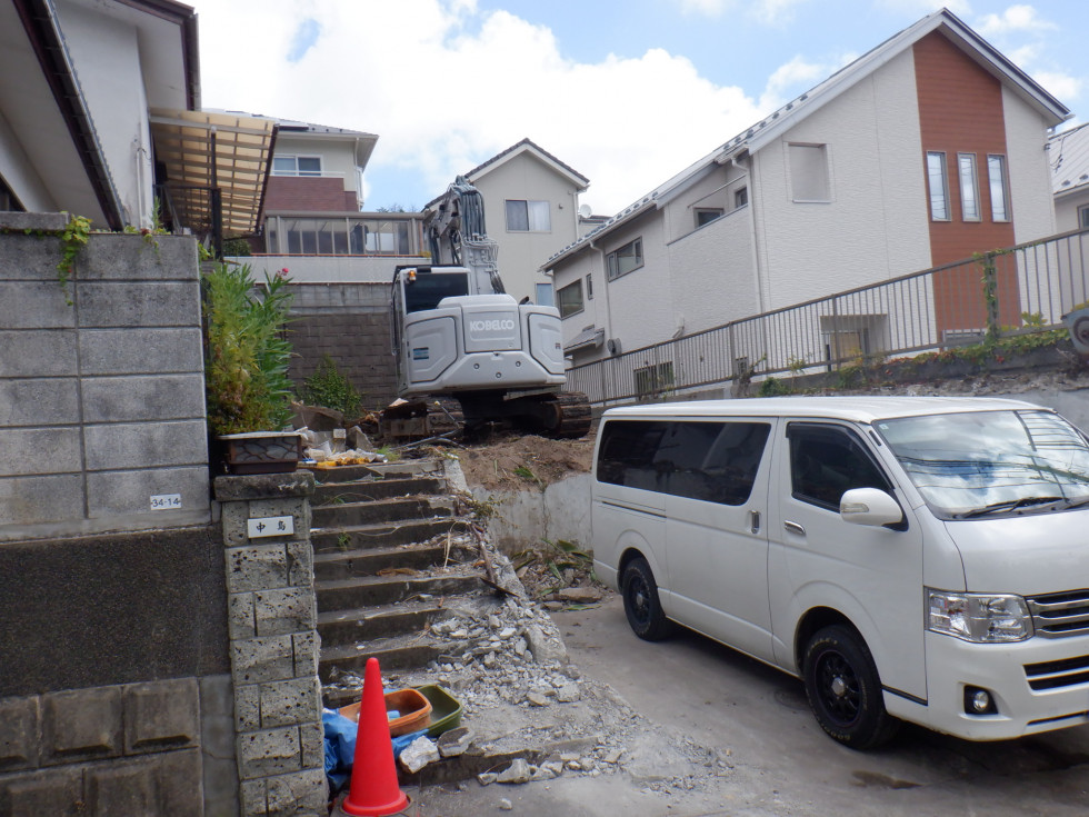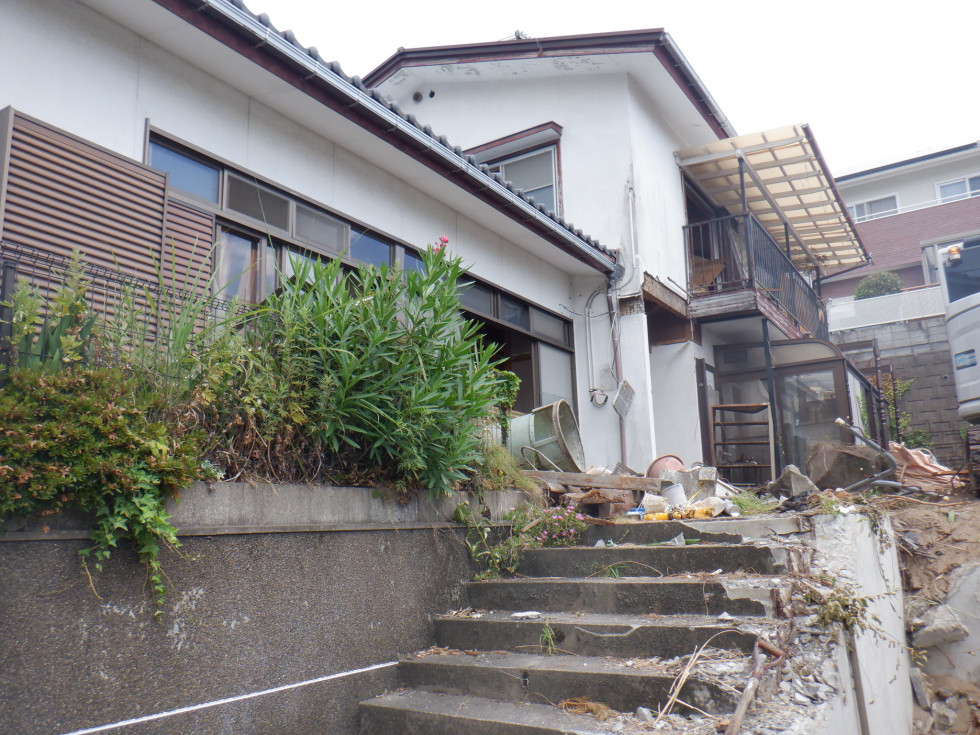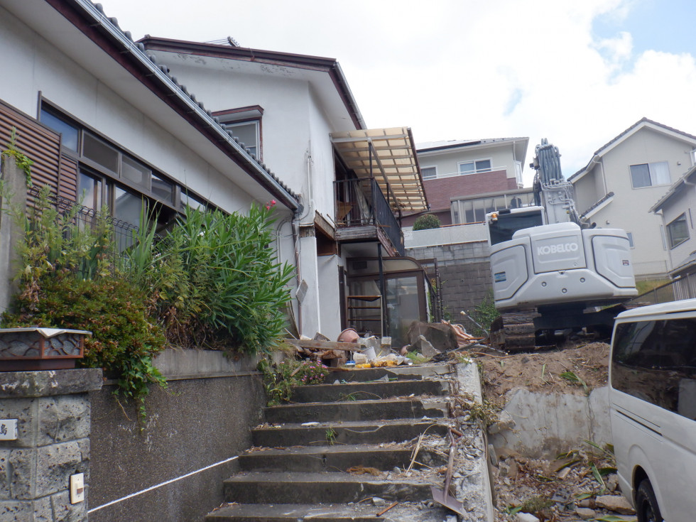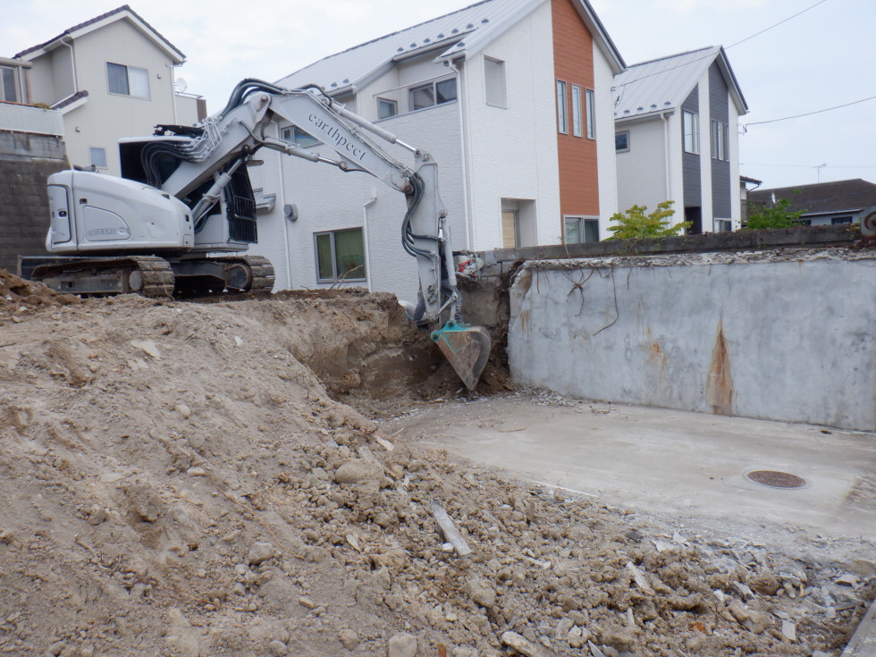 クリニック棟(木造平屋82m²)・住宅棟(RC造3階建て366m²)    0.7m³BHにて解体。市街中心部にほど近い住宅地にある規模の大きい建物。盛土された土地に建てられていた為、住宅棟に関しては、構造上は3階建てだが、実質4~5階建て位の高さがある建物。建物基礎の解体完了後、ご依頼により試掘を行う。大型重機の搬入には敷地が狭いため重機の選定、搬出のトラックの出入りの対応にも苦労した。近隣への騒音・振動対策は勿論のこと、建物裏手が墓地だったため、振動対策などにも細心の注意を払いながらの作業を行った。